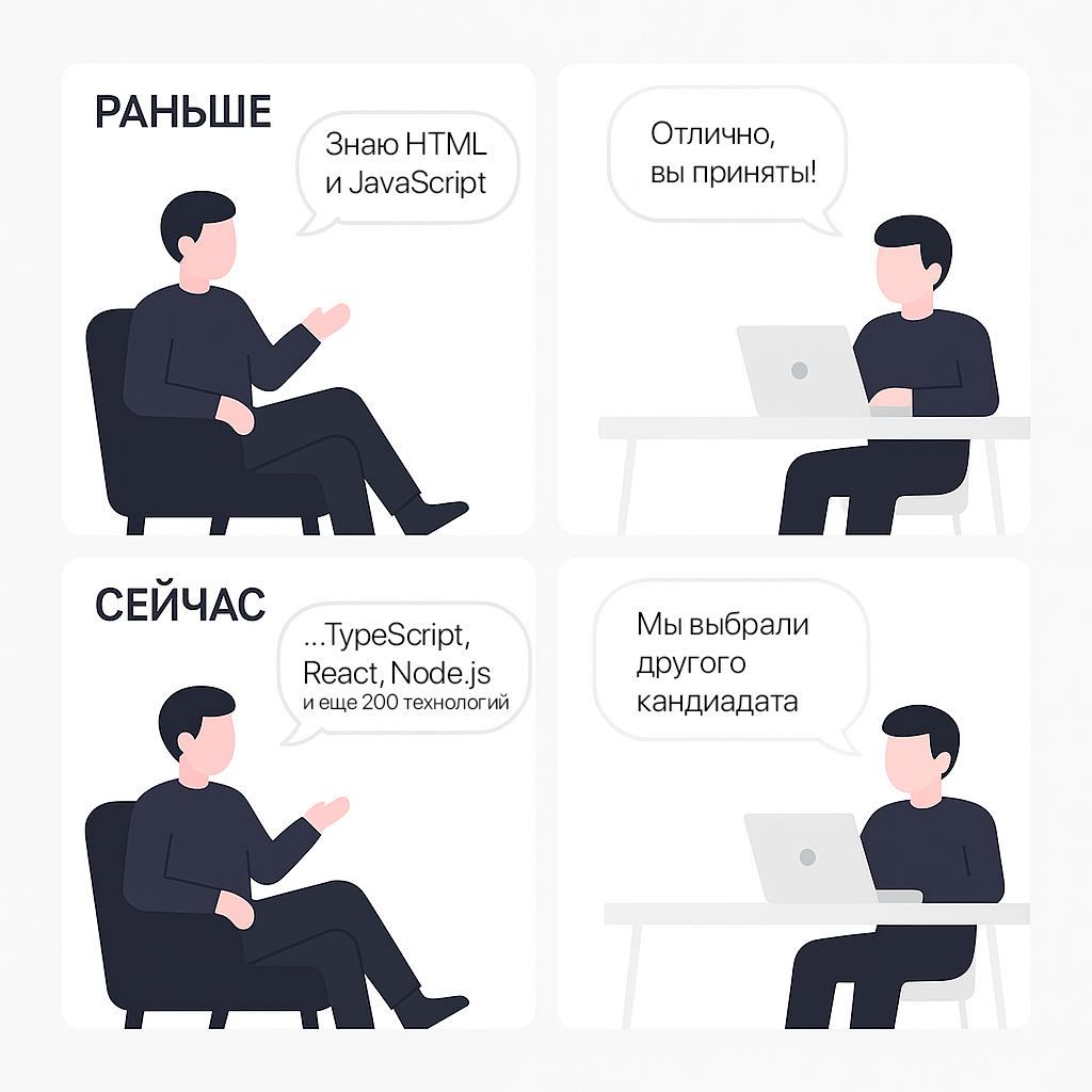 Раньше, чтобы войти в профессию, хватало просто знать HTML, CSS или один фреймворк. Этого было достаточно, чтобы взять первые заказы или устроиться джуном.